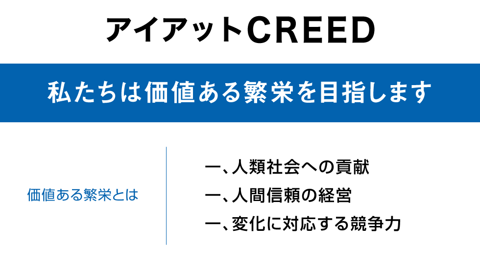 私たちは「アイアットCREED(信念、信条)」と名づけ次の企業理念を掲げさせていただいております。